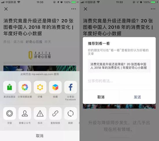 另外還可以提一句的是,微信強化了“看一看”的分享渠道。用戶在朋友圈、微信公眾號看到的文章可以直接選擇“好看”,分享至“看一看”。